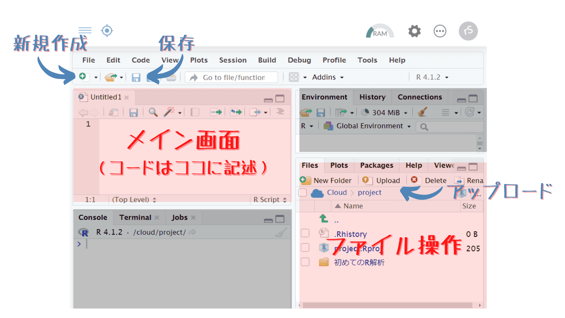 では、データの可視化をしてみましょう。左上のメイン画面に以下のコードをコピー&ペーストしてから、一度保存しましょう。保存先は先ほど作ったフォルダが良いでしょう。