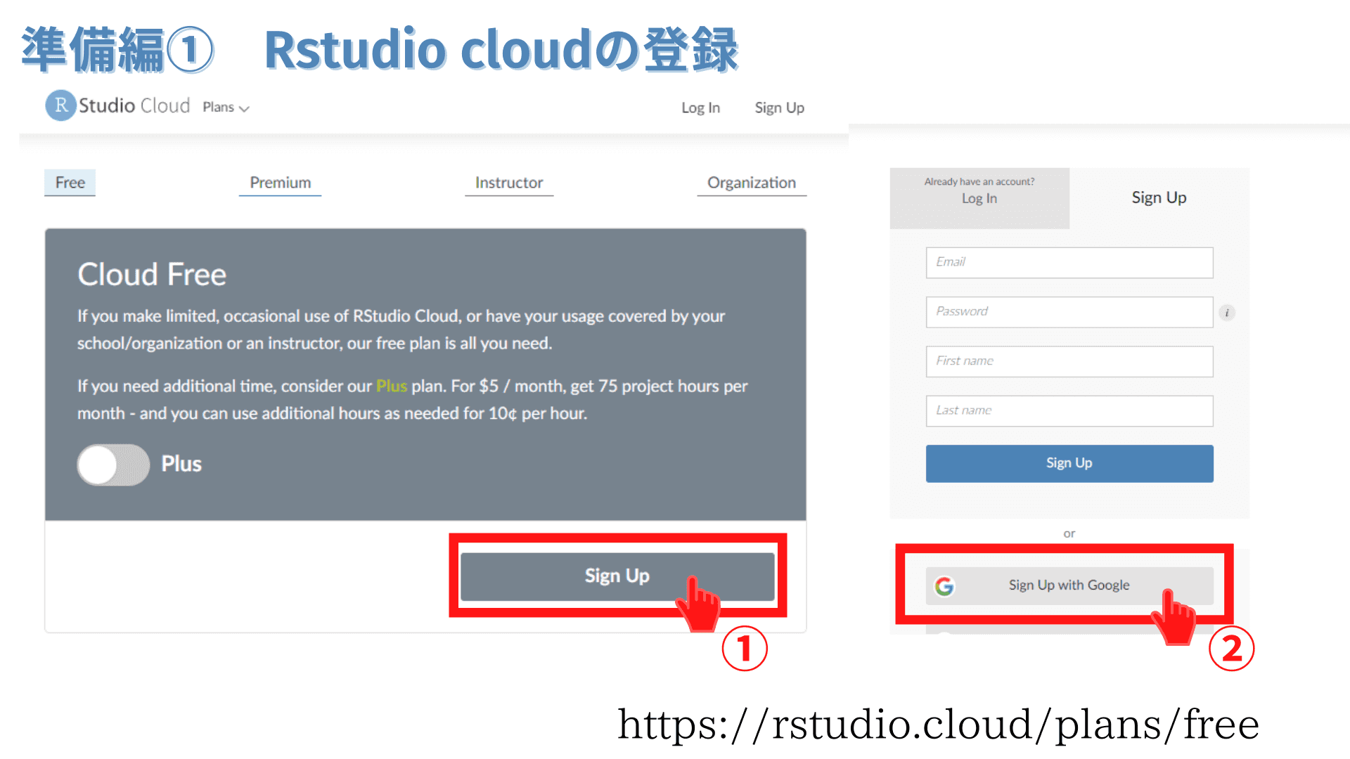 まずはじめに、Rstudio cloudというサイトでアカウントを作成しましょう。Rstudio cloudは、R解析環境のド定番であるRstudioをクラウド上で動かすことのできる、非常に便利なサービスです。