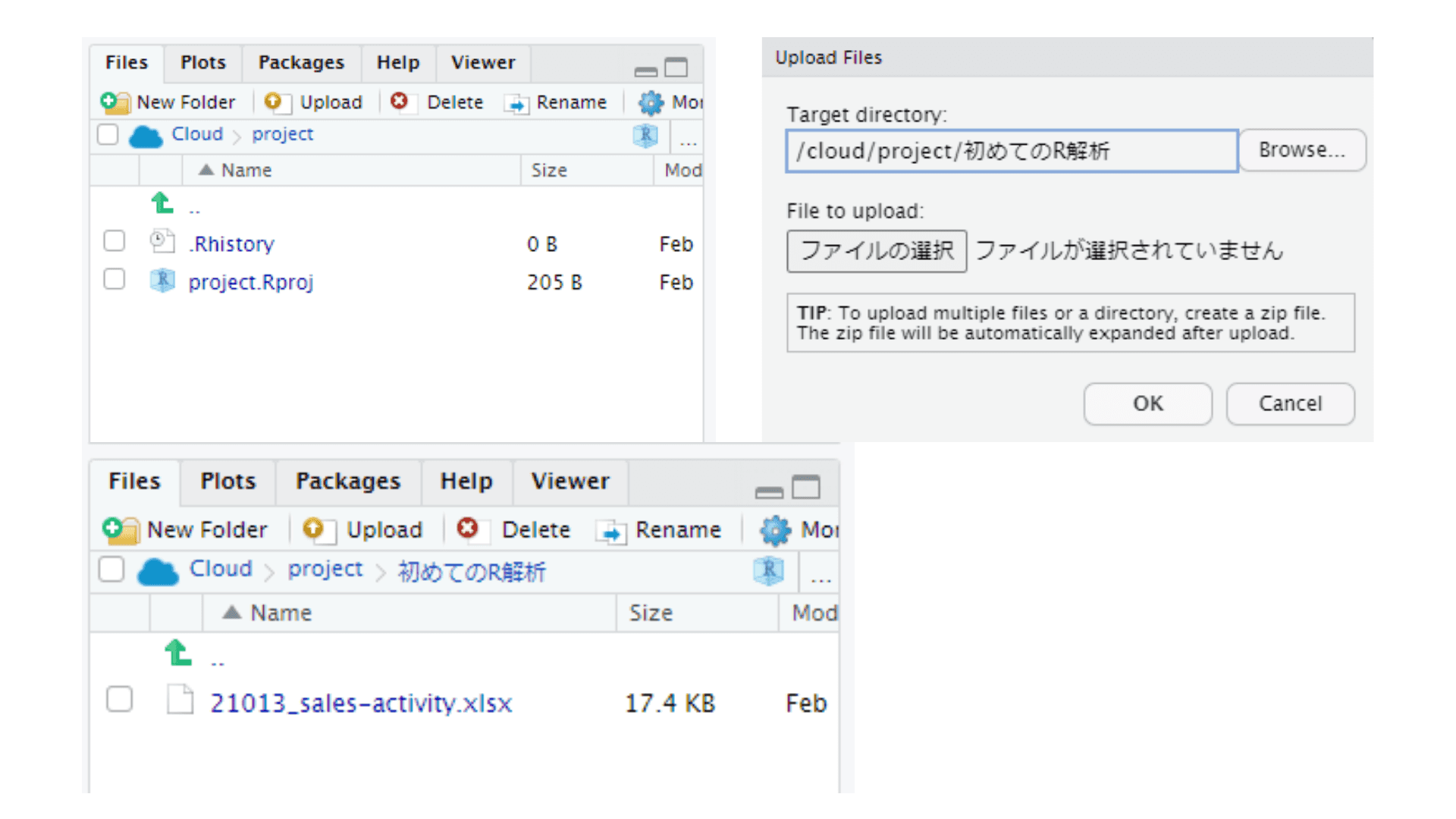 さておき、早速ファイルをアップロードしたいのですが、その前にフォルダを作って整理整頓しておきましょう。「New Folder」からフォルダを作成します。今回は「初めてのR解析」というフォルダを作成しました。フォルダができたら、ファイルをアップロードしましょう。