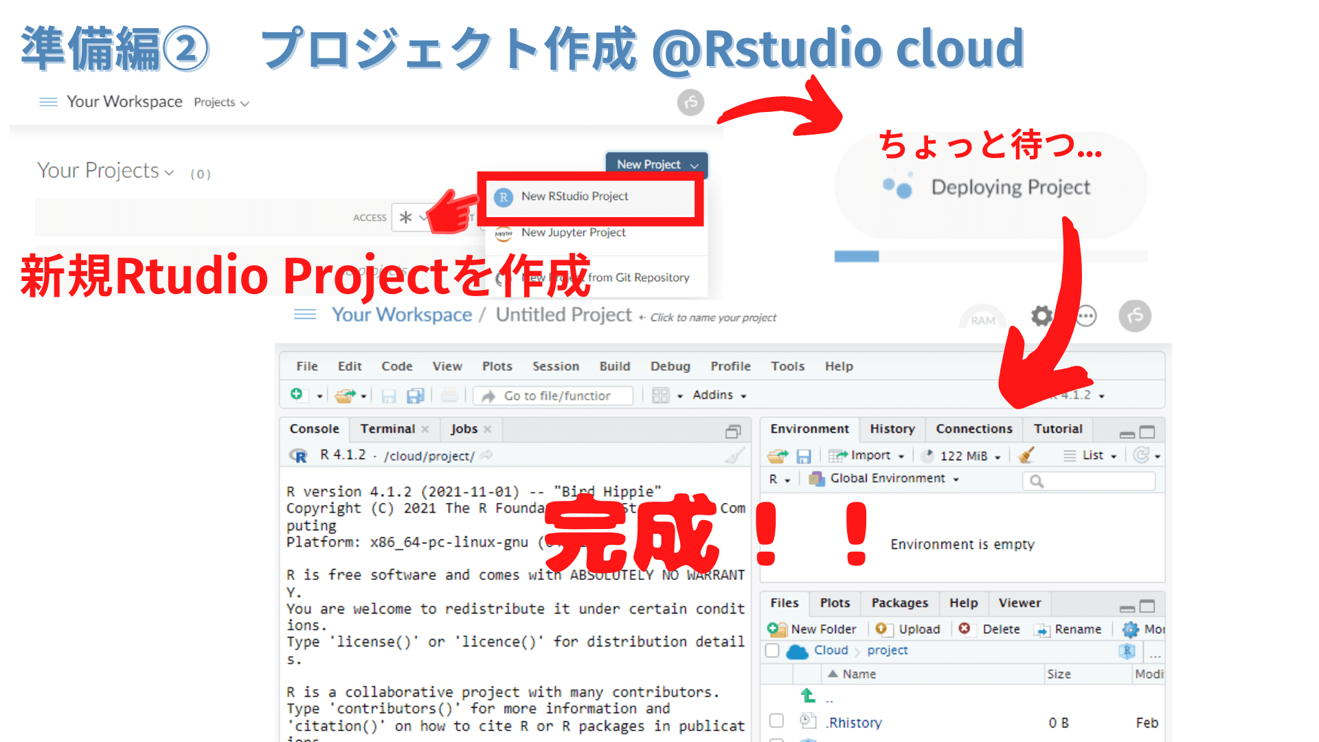 登録が出来たら、早速プロジェクトを作ってみましょう。右上の「New Rstudio Project」から新規プロジェクトを作成します。今回はRstudio Projectを作成します。Jupyter Projectの使い方もいずれ解説する予定です!