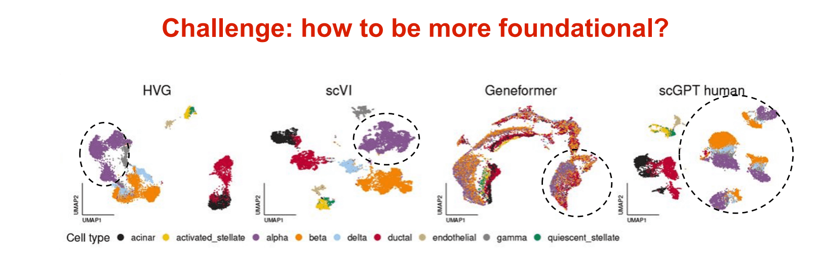 Although trained on millions of cells, current foundation models struggle with different assays in zero-shot settings (Kedzierska et al. bioRxiv 2023). • Pretraining often fails to separate biology from noise and sometimes has no effect (Boiarsky et al. bioRxiv 2023)