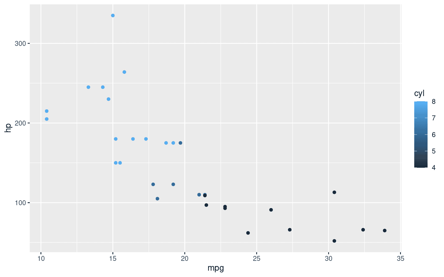 ggplot(aes(x = mpg, y = hp, col = cyl)) +
