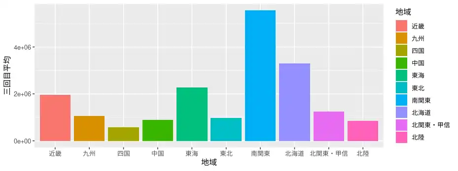 ggplot(aes(x = 地域, y = 三回目平均, fill = 地域)) +